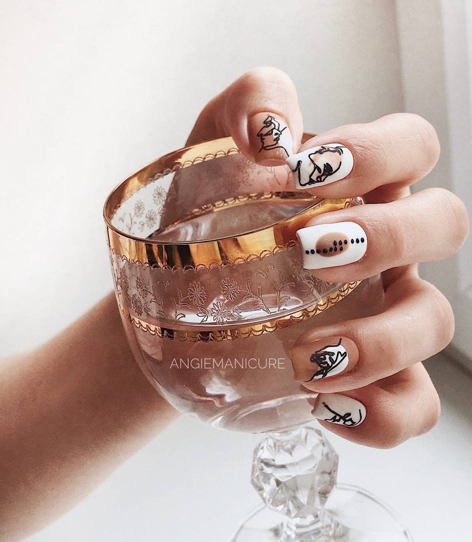 - С разнообразными рисунками – это могут быть веточки, сердечки, цветочки, линии и геометрические фигуры, даже изображения лиц. Такое сочетание в нынешнем и будущем сезоне вне времени и моды, а потому наиболее востребовано. Романтичные натуры предпочитают изображение цветов, сердечек и бабочек. Такие рисунки идеально смотрятся на нюдовой, молочной или белой основе и придают маникюру особую изюминку.