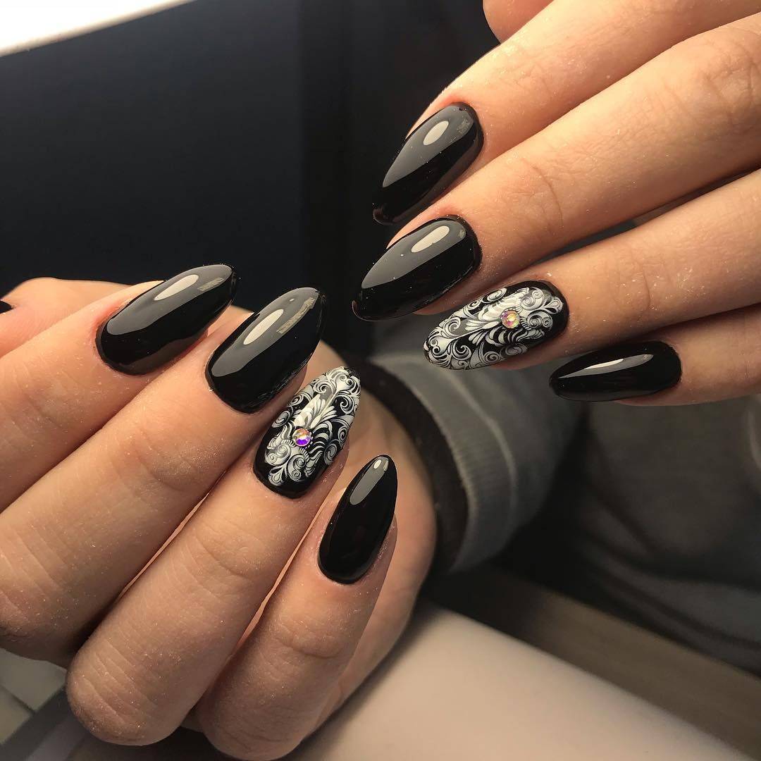 Однотонное чёрное покрытие, как бы это удивительно не звучало, всегда смотрится стильно и по праву называется настоящей классикой. Вы вполне можете оформить на ноготках матовое или глянцевое покрытие и не нарушать идиллию разного вида дополнениями, что особенно актуально для строгих и деловых аутфитов. Но, как известно, лето не обходится без ярких касок и блестящих идей. Расположите в прикорневой зоне или на кончике нескольких ноготков серебристые стразы, блестящие полоски или бульонки. Как вариант, можно выделить акцентные ноготки переливами втирки, оттисками фольги, красочными изображениями или «икорным» дизайном. Любое предложение неимоверно преобразит строгость маникюра.