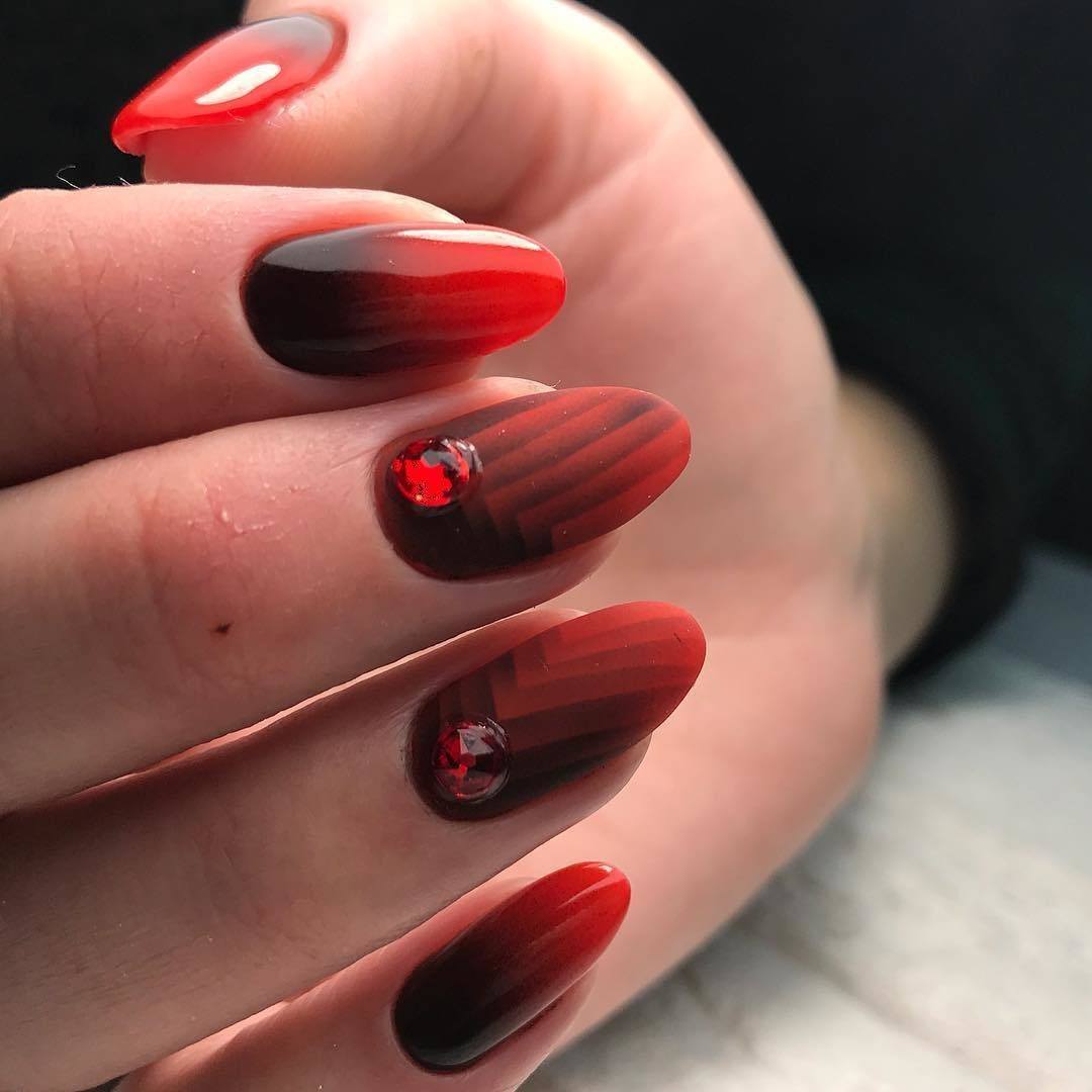 - Омбре – нежные переходы из красного в белый цвет смотрятся потрясающе. Красный дизайн с градиентом в любом исполнении одинаково хорош. Переход из красного в черный смотрится по-особому интригующе и в какой-то степени мистически. По случаю торжества будет уместно украсить омбре блестками или стразами. Маникюр в таком исполнении вмиг становится нарядным.