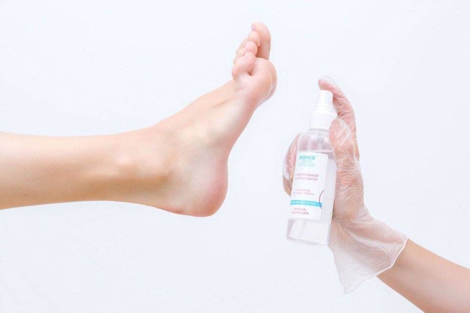 - Наносим на кожу стоп универсальный нейтрализатор кератолитиков DOMIX GREEN PROFESSIONAL.