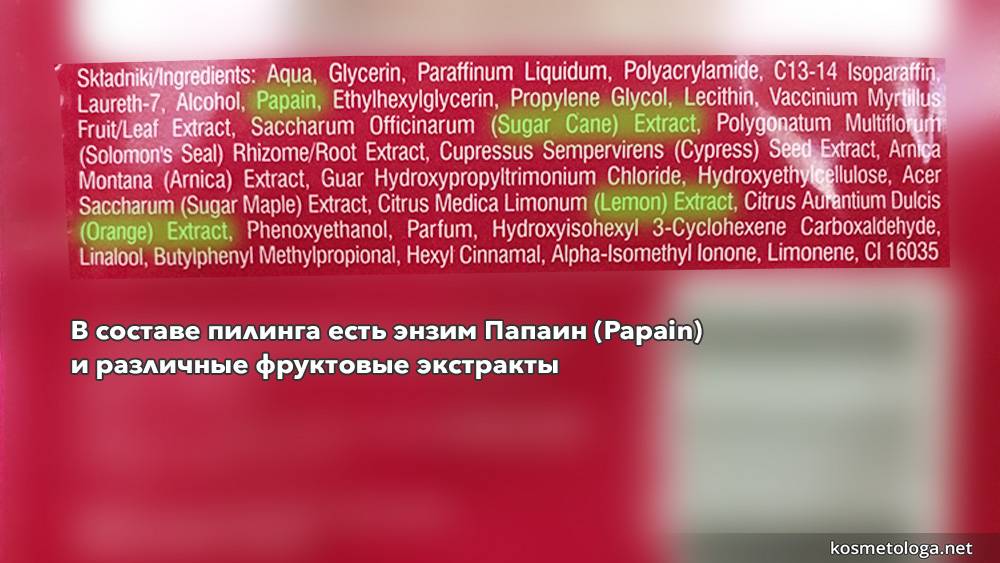 И в составе пилинга мы действительно можем увидеть такой энзим как Папаин (Papain) и различные фруктовые экстракты.