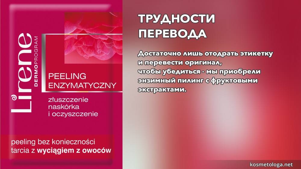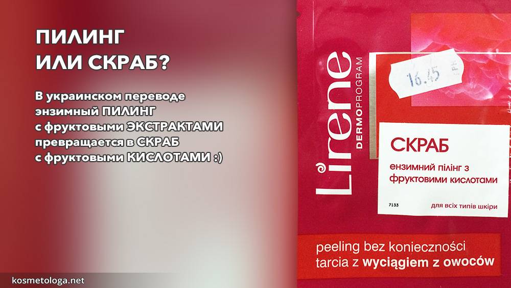 Обратите внимание на название этого пилинга – это отличный пример ошибок перевода. На украинском языке на пилинге крупными буквами написано СКРАБ