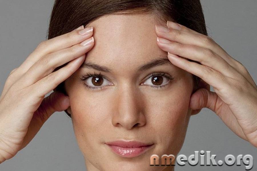 - Стараться поднять с усилием брови вверх как можно выше, одновременно пальцами давить вниз.