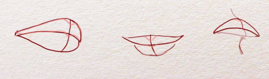 Рисование губ в таком положении также нужно производить пошагово: