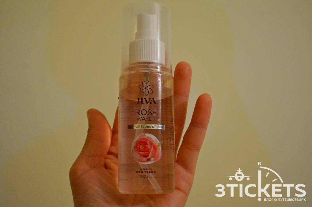 Розовая вода — всем известное и полезное косметическое средство, которое получается путем дистилляции цветков розы. Собственно, в состав воды входят только эфирное масло роз и дистиллированная вода. Розовая вода придает коже свежесть, эластичность, используется также для очищения кожи. На востоке розовая вода всегда считалась водой красоты, способной на долгие года продлевать молодость. Розовую воду в Индии выпускает много косметических фирм. Самя популярная — розовая вода от Dabur. Я же ее не нашла и купила розовую воду от Jiva Ayurveda. Цена 100 мл бутылочки (с пульверизатором для удобного нанесения на кожу) — всего 36 рупий. При ежедневном нанесении на лицо, хватает такой бутылочки на 2 месяца.