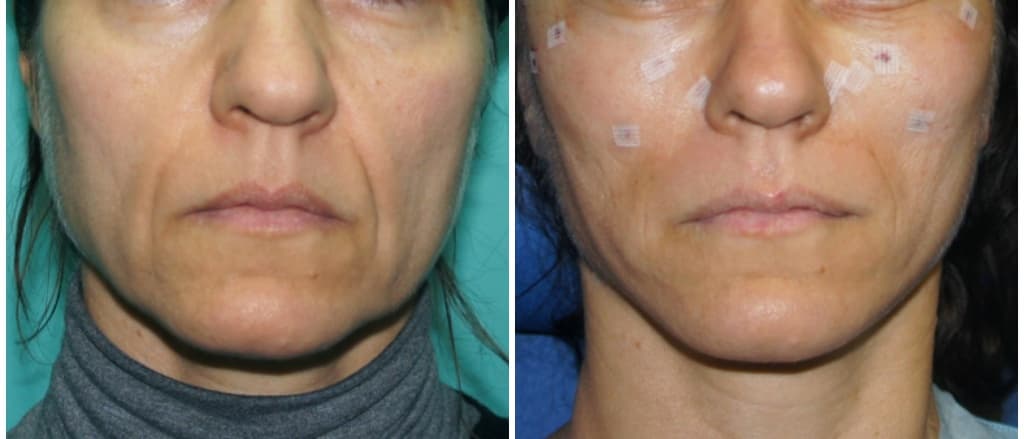 Перед вторым этапом пациентка отметила значительное улучшение состояния кожи: повышение плотности, разглаживание текстуры, уплощение морщин, выравнивание цвета лица.