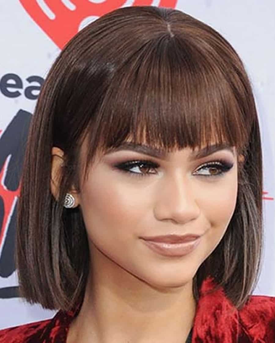 Замаскировать недостатки треугольного лица поможет густая прямая чёлка. Она скроет широкий лоб