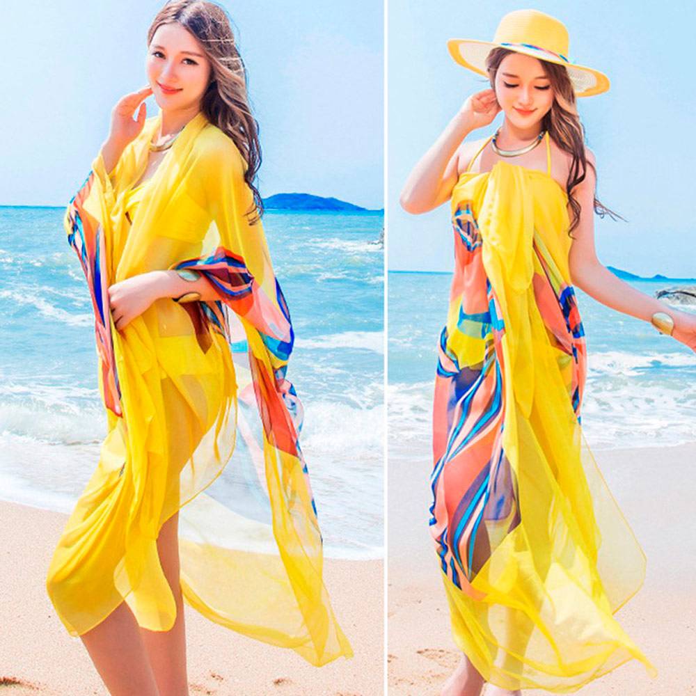 Возможно, вы удивитесь, но парео тоже является видом шарфа. Фото пляжных образов в легкой накидке сразу же настраивают на волну релакса. Воздушный струящийся платок шьют из шифона, льна, шелка и хлопка. Чаще всего парео окрашивают в насыщенные оттенки и украшают богатыми узорами. Изделие защитит кожу от палящего солнца, а также скроет недостатки фигуры.