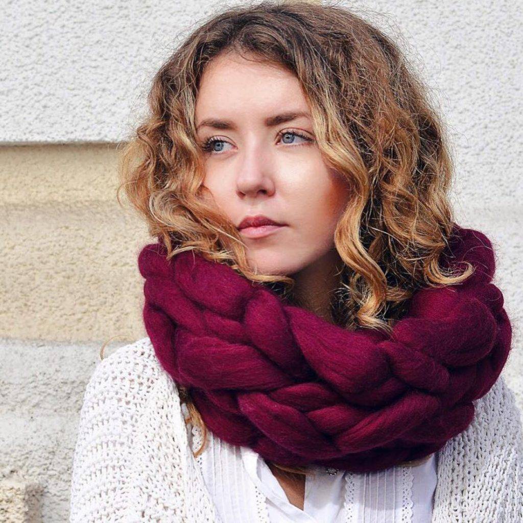 Снуд — один из самых известных видов шарфов на шею. Он имеет форму круга и надевается через голову. Снуды хорошо сохраняют тепло и защищают от морозов. Изделия смотрятся очень элегантно в качестве головного убора. Если вы не любите шапки, снуд станет отличным решением.