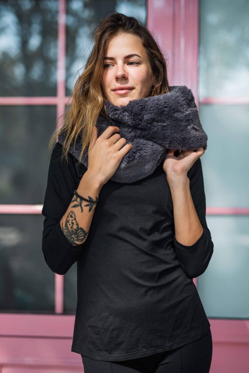 - Вязаные шарфы- хомуты серого цвета. Самый универсальный вариант снуда. Носят его под куртку или пальто черного либо серого цвета.