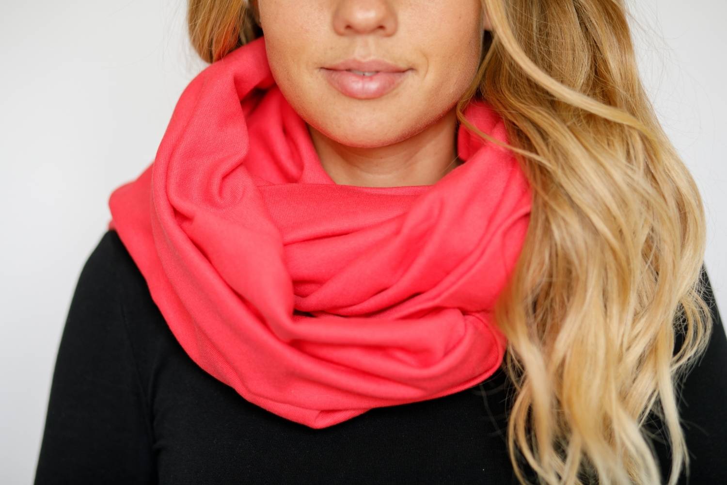 Важно, что снуд не должен быть слишком объемным, поэтому делаем максимум 1 оборот. Большая пышность создаст колоноподобный силуэт и от шарфа будет больше вреда, чем пользы