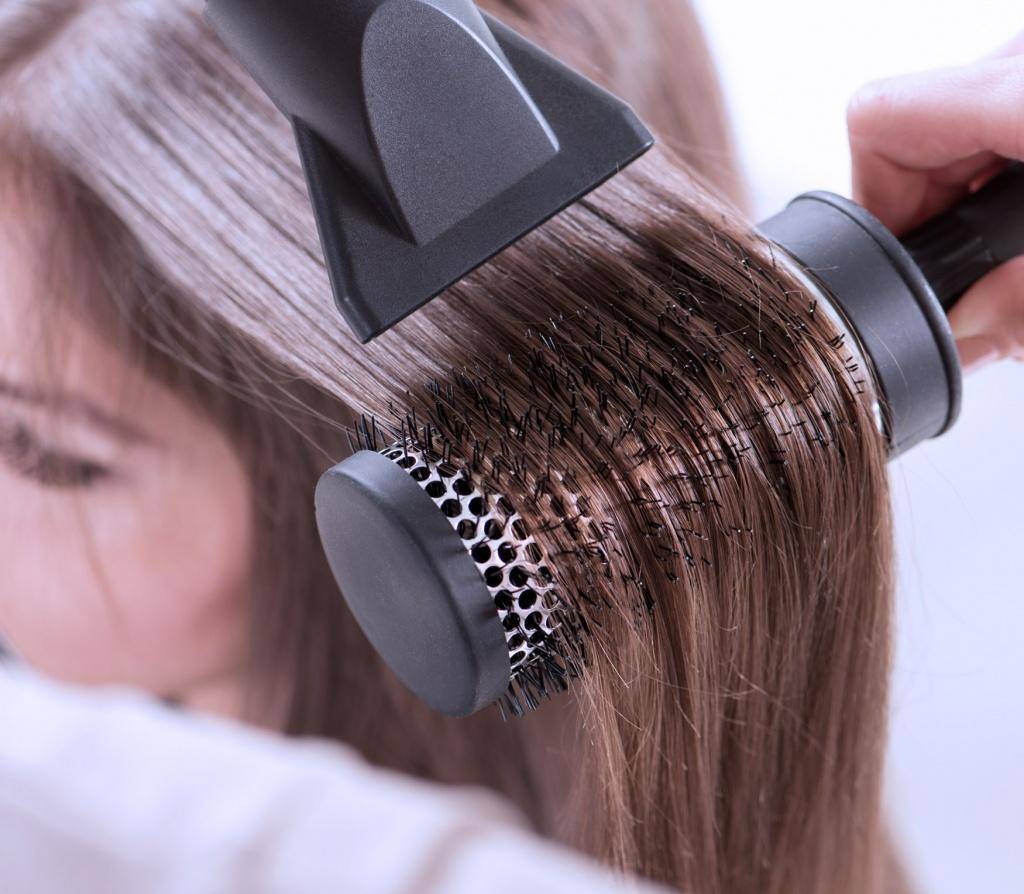 - Брашингом (круглой щёткой) вытянуть волосы, если необходимо. Для этого они должны быть высушены более чем на 80%.