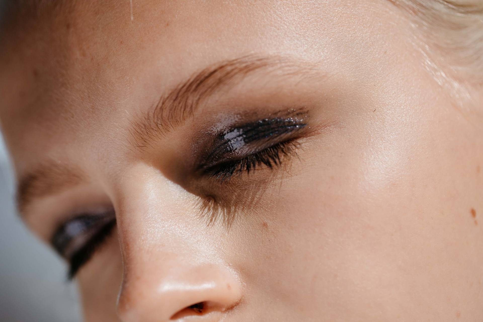 - Теперь берём светло-серые тени и наносим под бровь.