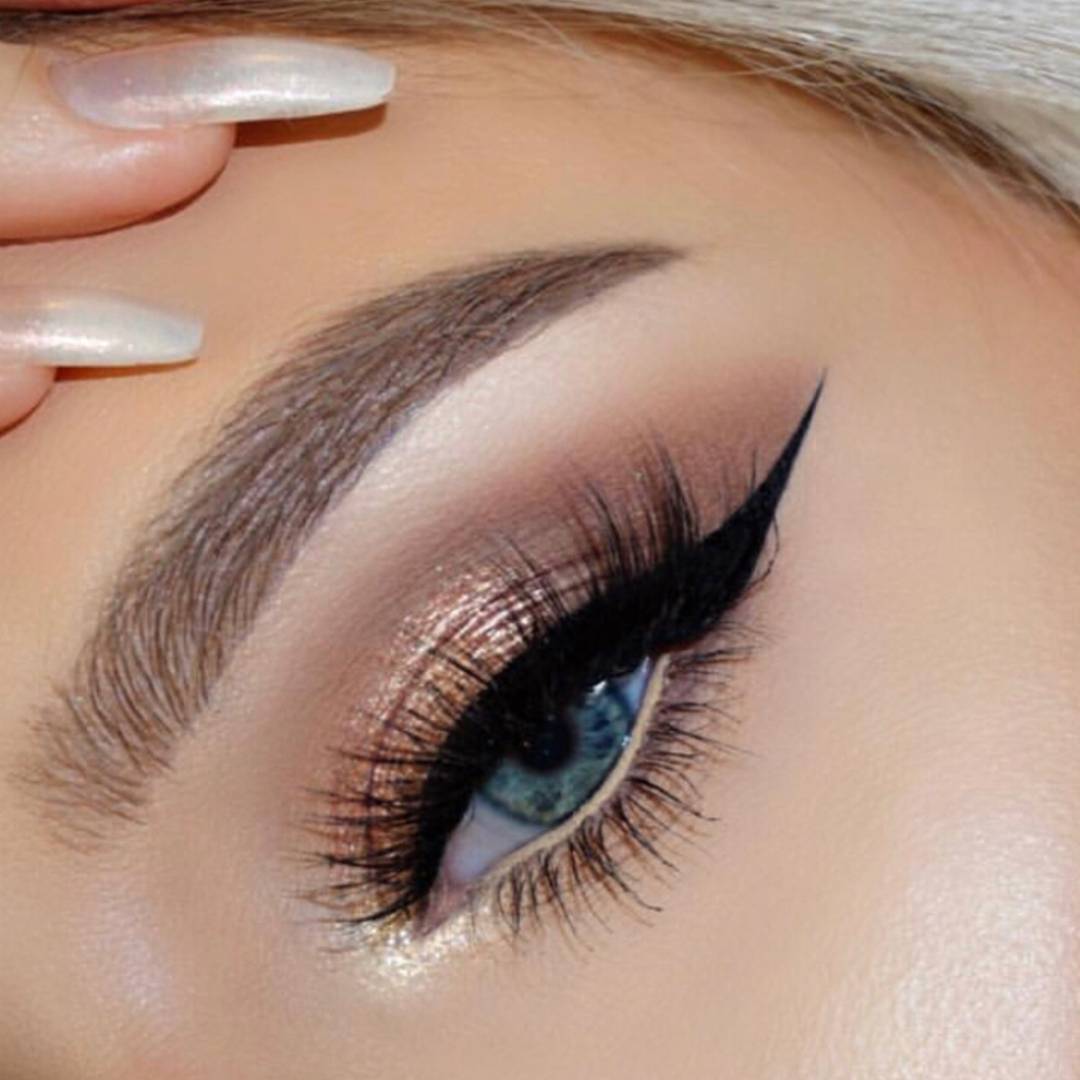 Подойдут как матовые средства, так и с эффектом металлик. К слову, о сиянии: светлый золотой лайнер тоже красиво «подсветит» карие глаза.