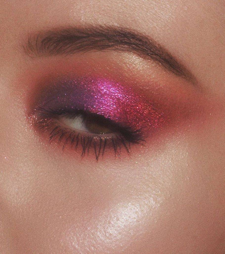 Глиттер: он везде, и это уже новая реальность. Если хотите снизить градус блеска, то днем выбирайте не очень яркие глиттеры или с мелкими сияющими частицами, которые скорее похожи на легкий шиммер. Если размер для вас не имеет значения, можете взять глиттер с крупными частицами и врассыпную нанести их на подвижное веко.