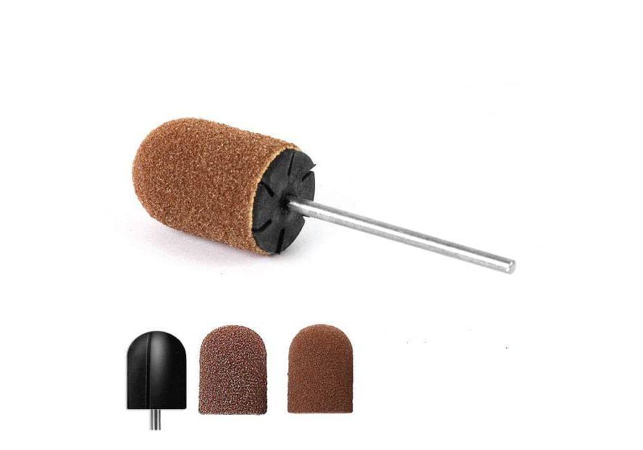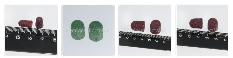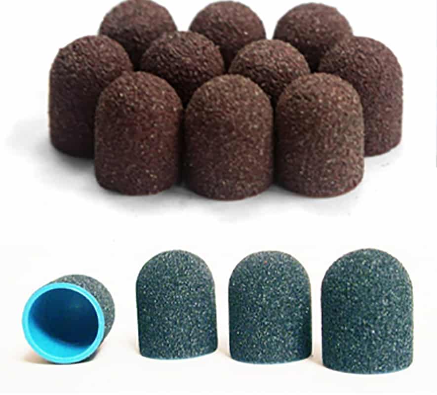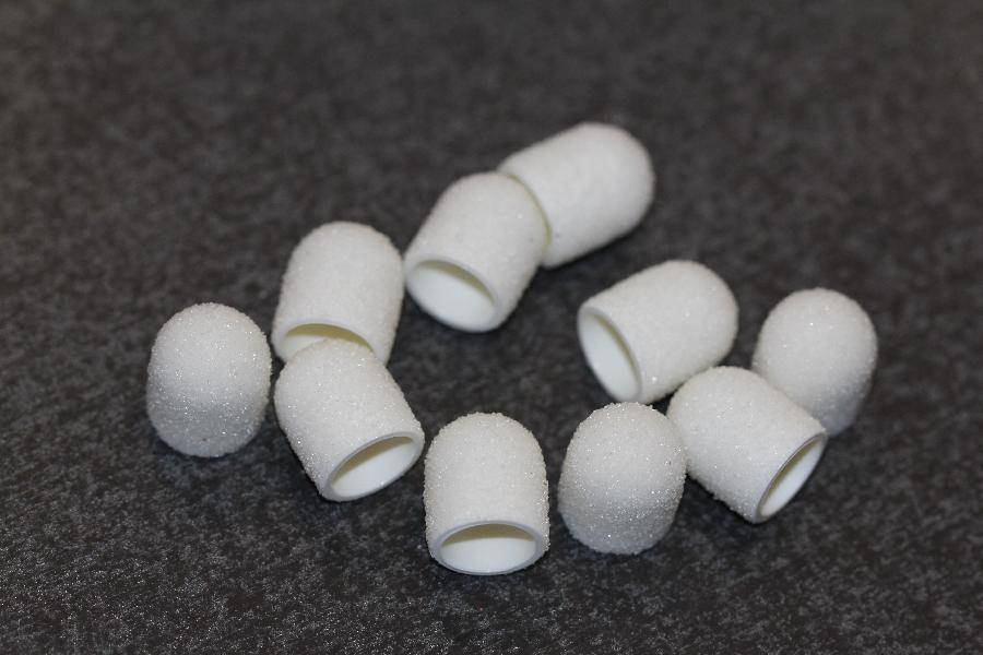 - Крупнозернистые колпачки (40-80 грит) используются для обработки загрубевших участков кожи, опила мозолей и натоптышей. Также они часто применяются для обработки искусственных ногтей, поскольку их абразивности вполне достаточно для работы с материалами, используемыми во время наращивания. Такие колпачки эффективно опиливают толщину искусственного ногтя и хорошо подходят для корректировки его формы.