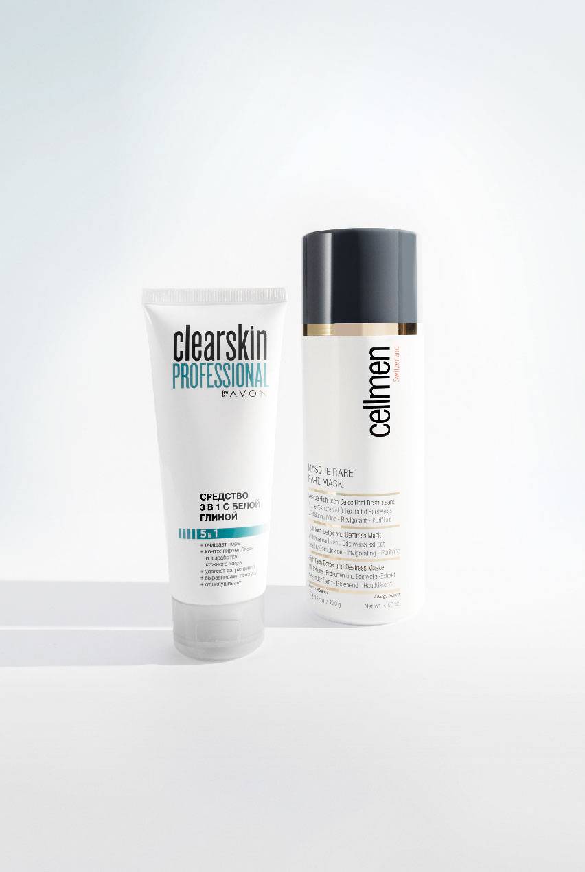 Очищающий крем, скраб и маска с белой глиной 3 в 1 Clearskin Professional, Avon; антистресс- и детокс-маска с ценными глинами и натуральными экстрактами Rare Mask, Cellmen