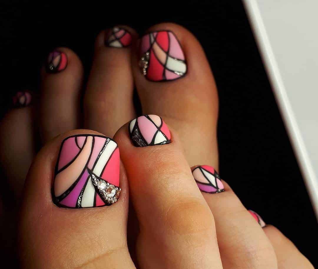 Геометрические узоры — украшают любой педикюр, но наиболее оригинально они выглядят на покрытиях, близких к натуральному бежевому цвету. Среди модных тенденций стали появляться более плавные линии и фигуры без четких границ и углов. Сам рисунок может наноситься не только лаковыми покрытиями, но и стразами, блестками, а также с помощью штампов и термопленок.