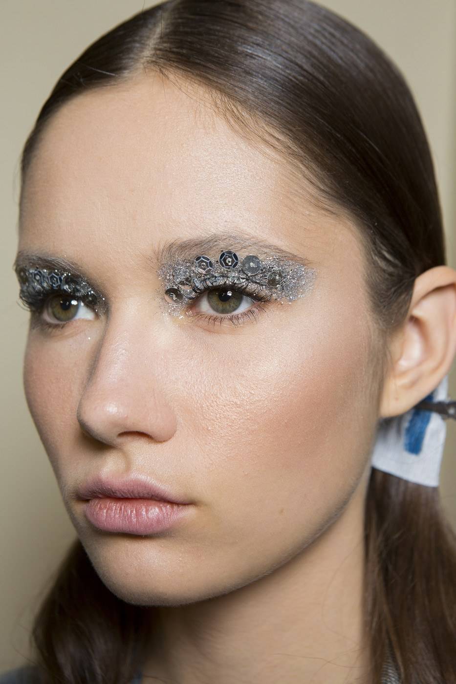 Модные показы в Нью-Йорке, Милане, Лондоне прочно закрепили победу глиттера среди самых популярных тенденций летнего сезона 2018. В тренде лавандовые, синие, фиолетовые, розовые, серебряные блестки, которые используются для макияжа практически на любой области лица. Так, визажисты предлагают наносить крупные голографические блестки на всю поверхность подвижного века.