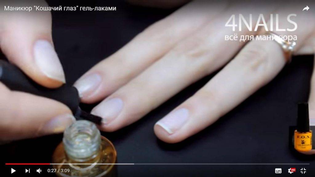 Сделать маникюр с эффектом «кошачий глаз» можно самому в домашних условиях с использованием специального гель лака. Перед тем как приступить к созданию этого интересного дизайна можете просмотреть несколько обучающих видео, а также по фото определиться с тем, какой цвет лака вы хотите приобрести и использовать.