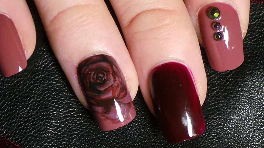 Помимо золота винный оттенок великолепно сочетается с различными стразами. Вкрапления, похожие на капельки росы, подарят маникюру нотку изысканной роскоши, а гель-лак поспособствует сохранению результата на несколько недель.