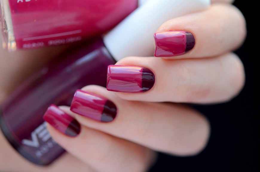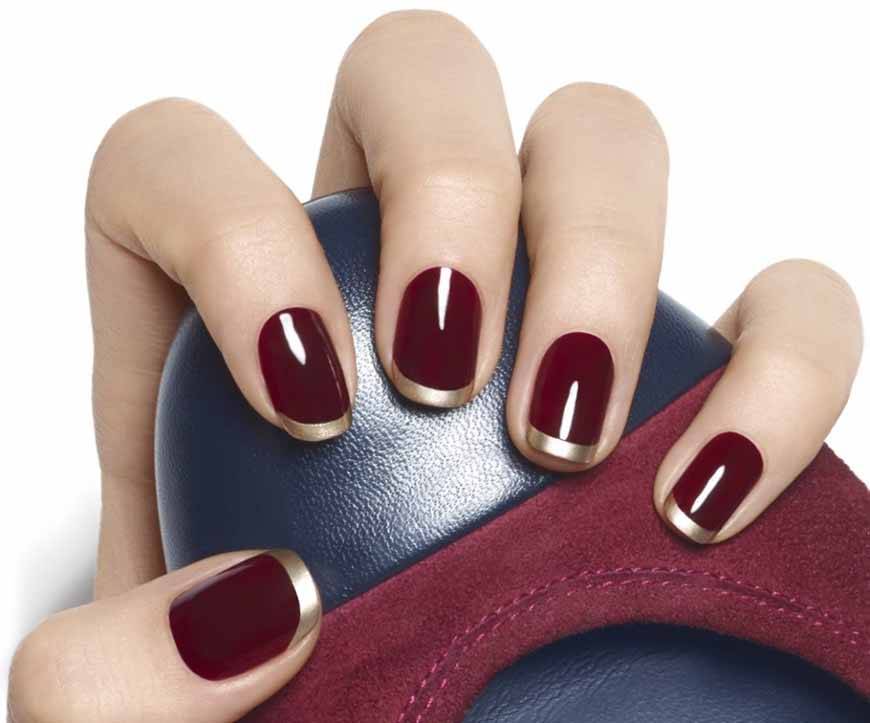 Французский маникюр уже давно не ассоциируется только лишь с прозрачным или кремовым лаком и белыми кончиками. Оригинальный вариант – сделать кончики цвета марсала, а базовое покрытие – прозрачным, кремовым или даже в цвет кончиков (или на тон светлее).
