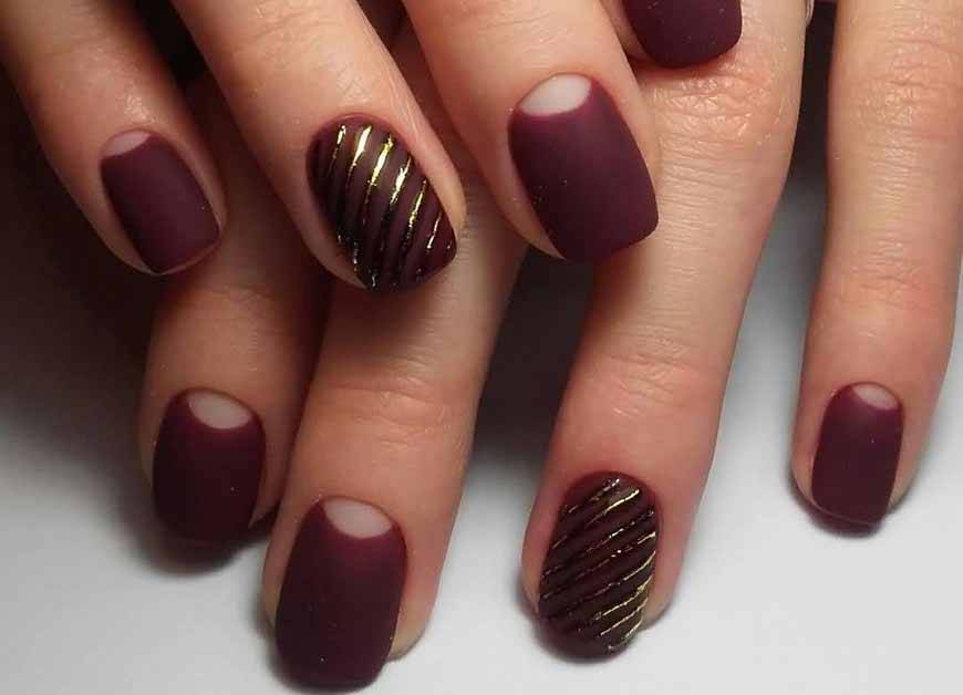Можно рисовать строгие «дорожки» золотом вдоль каждой ногтевой пластины, прокрашенной лаком цвета марсала. Смотрится оригинально, свежо.