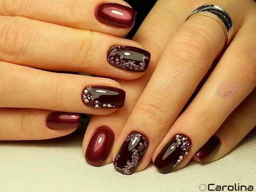 - Для торжественных мероприятий отличным решением станет тандем винного лака с декором – золотистыми камнями, стразами, бульонками, блестками.