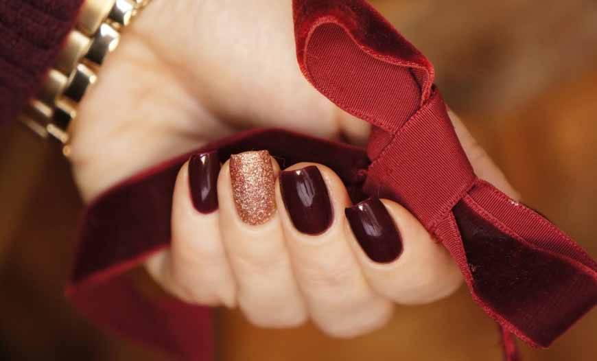 Если вы собираетесь на вечеринку с друзьями, в ресторан на романтическое свидание, тогда сделайте маникюр марсала с блестящим гель лаком золотистого, серебряного цвета или в тон к основному лаку. При этом обязательно сочетайте такой маникюр с соответствующей одеждой или аксессуарами: вечерним однотонным платьем, стильным костюмом, сумочкой с металлическим ремешком, поясом, золотыми или серебряными украшениями и т. п.