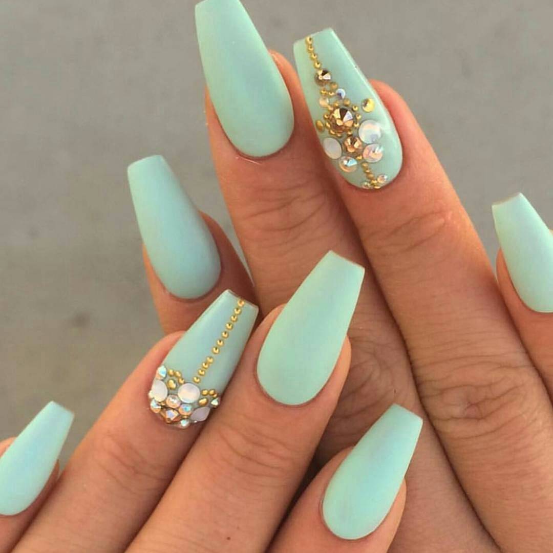 Стразы с мятным маникюром придадут образу аристократичности, мудрости и утончённости. Сделайте объёмную инкрустацию, или используйте минимальное количество небольших страз, и ваш образ станет более парадным. Это отличный выбор для подружек невесты или романтического отпуска с любимым.