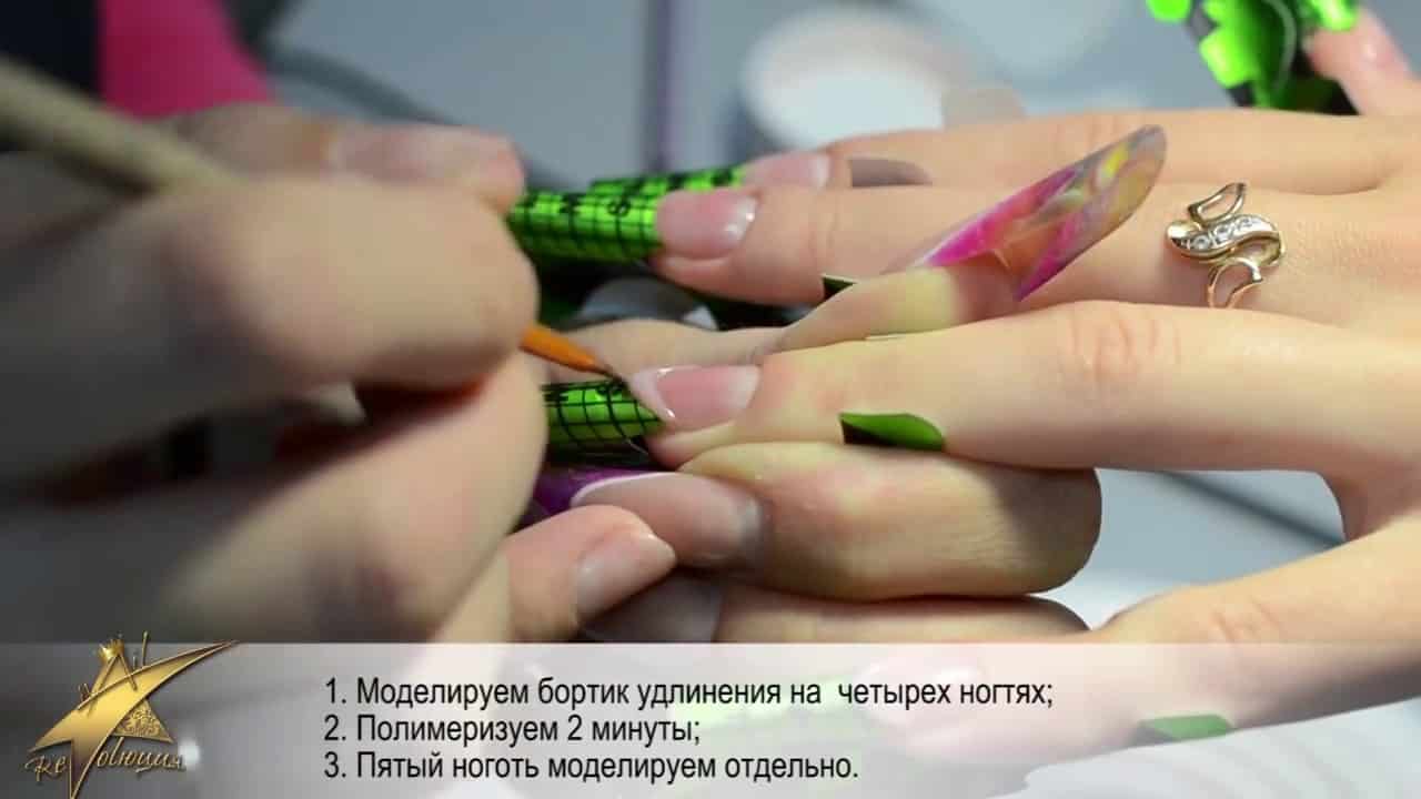 О том, как выполнить гелевое наращивание на формах, смотрите в следующем видео.