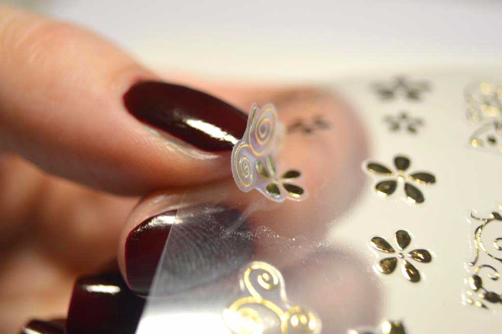 - Элементы, имеющие клейкую поверхность. Такие изображения наклеиваются самостоятельно, так как уже имеют клейкую основу. Для создания маникюра достаточно просто отклеить бумажную основу.