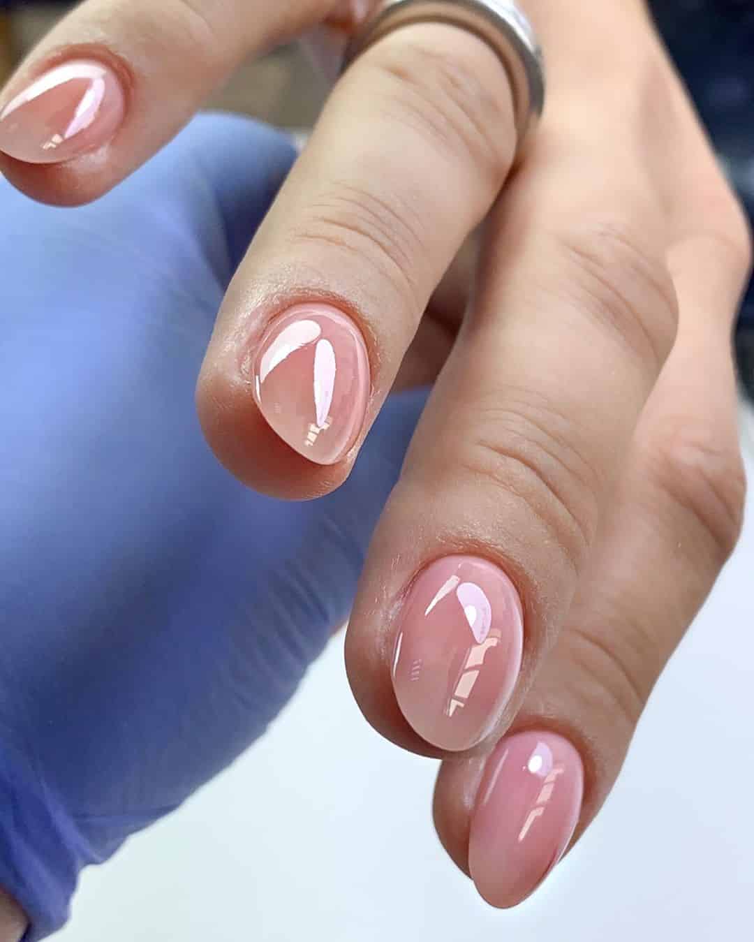 Нюдовый маникюр. Такой оттенок не требует дополнительного декора, хотя тонкие полоски скотча или стразы и полубусины сделают этот маникюр манящим и загадочным.
