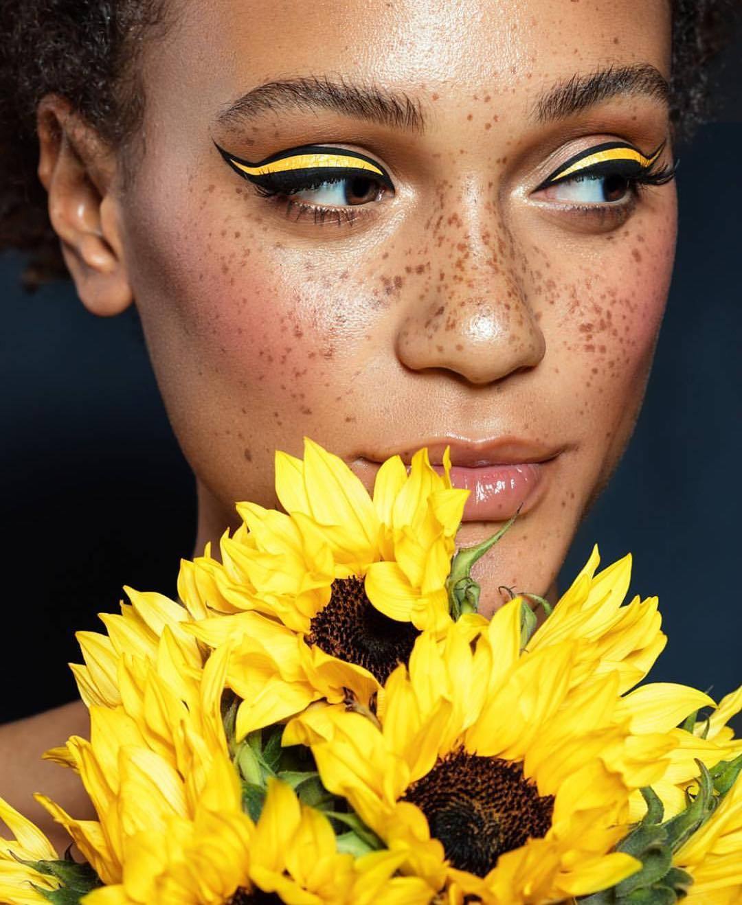 - Обведите карандашом черного, темно-синего или коричневого цвета контур глаз. Выделите внутренний уголок глаз тенями желтого цвета.