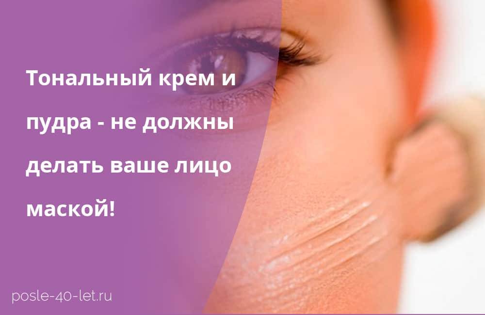 - тональная основа слишком плотной консистенции, хоть и скроет все недостатки кожи, но при этом придаст ей неестественный вид и создаст эффект маски. Таким образом, на поверхность «вылезут» все морщины, которые успели проявиться до 45 лет;