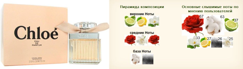 Флакон Chloe Eau de Toilette (2015); официальная пирамида композиции, заявленная компанией-производителем; пирамида, определенная потребителями парфюма
