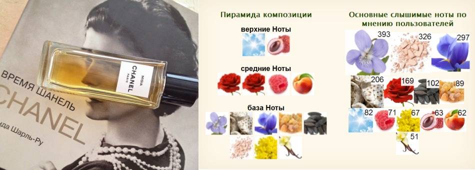 Флакон Les Exclusifs de Chanel Misia; официальная пирамида композиции, заявленная компанией-производителем; пирамида, определенная потребителями парфюма