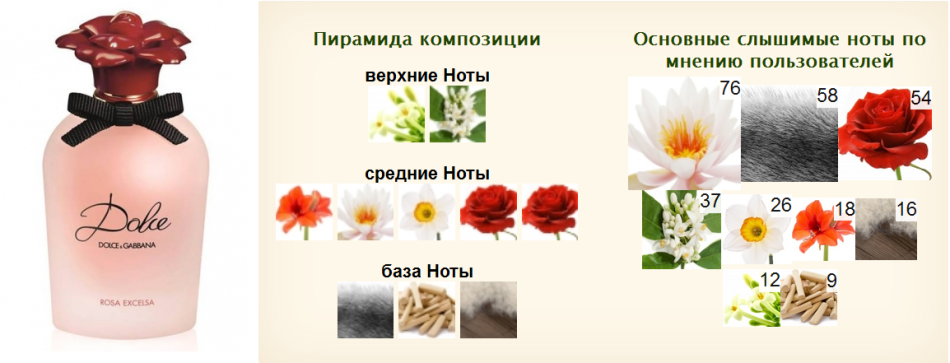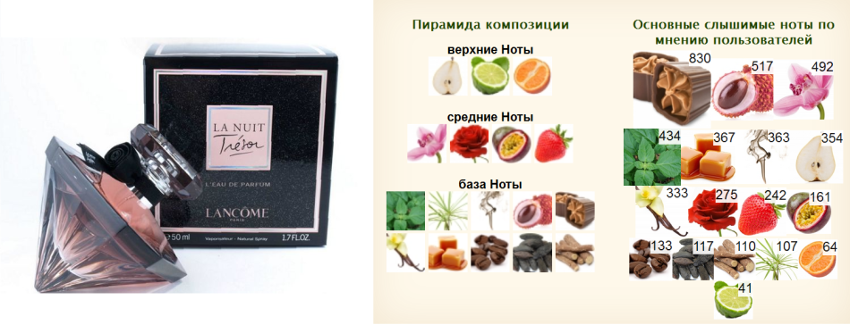 Флакон La Nuit Tresor Lancome; официальная пирамида композиции, заявленная компанией-производителем; пирамида, определенная потребителями парфюма