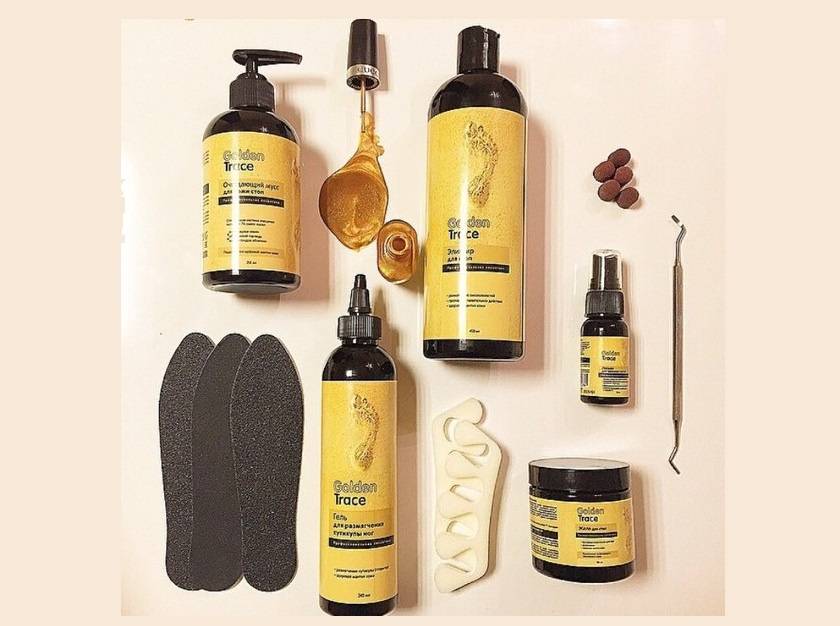 Среди препаратов профессиональной косметики для ног выделяется марка Голден Трейс, имеющая в составе эликсиров специальные безопасные вещества. Наибольшее значение представляют данные компоненты косметики — мицеллы и натуральные фруктовые кислоты. С помощью них средства линии golden аккуратно очищают стопы и ногти от лишних частичек эпителия.