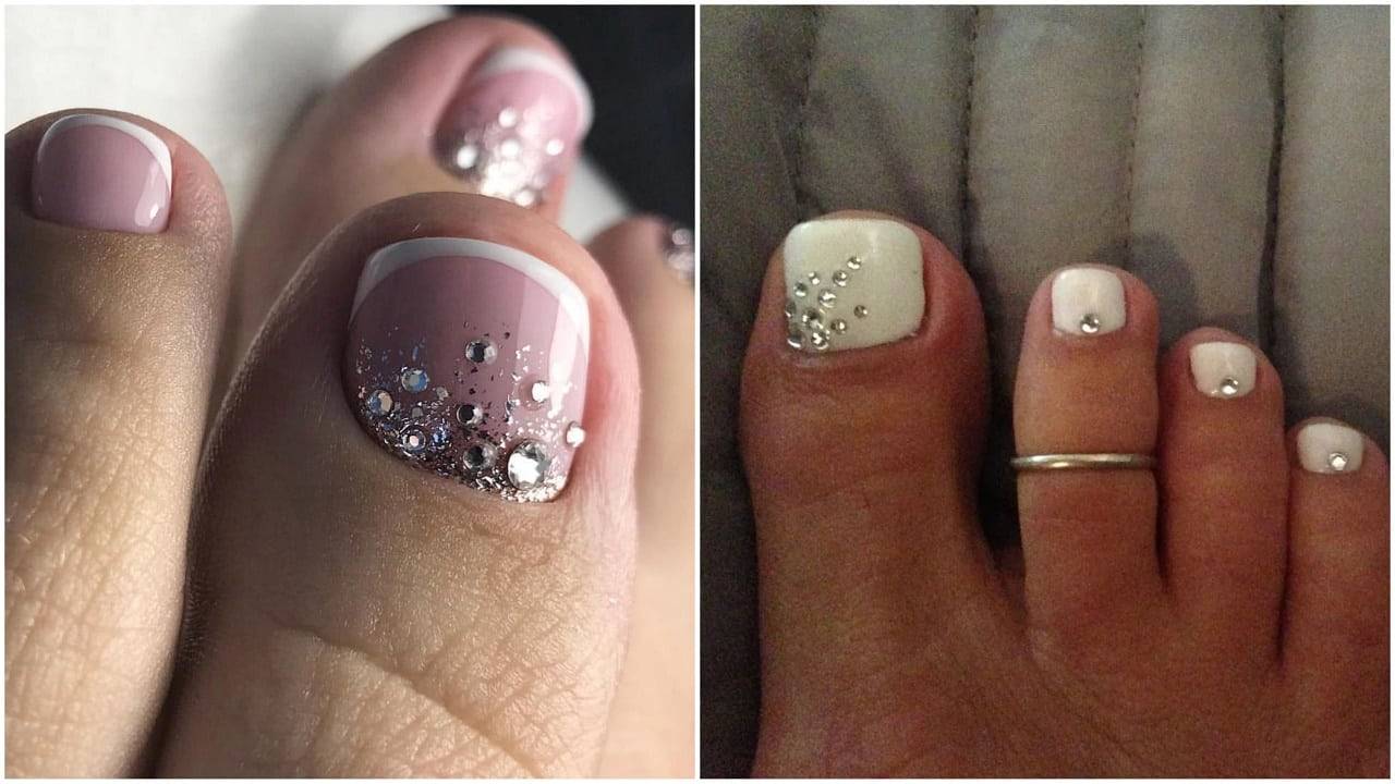 Французский педикюр сам по себе считается очень нежным дизайном ногтей. Придать ему немного блеска помогут стразы и бульонки. Лучше, если улыбка будет выделена на каждом ноготке, иначе педикюр может получиться слишком невзрачным.