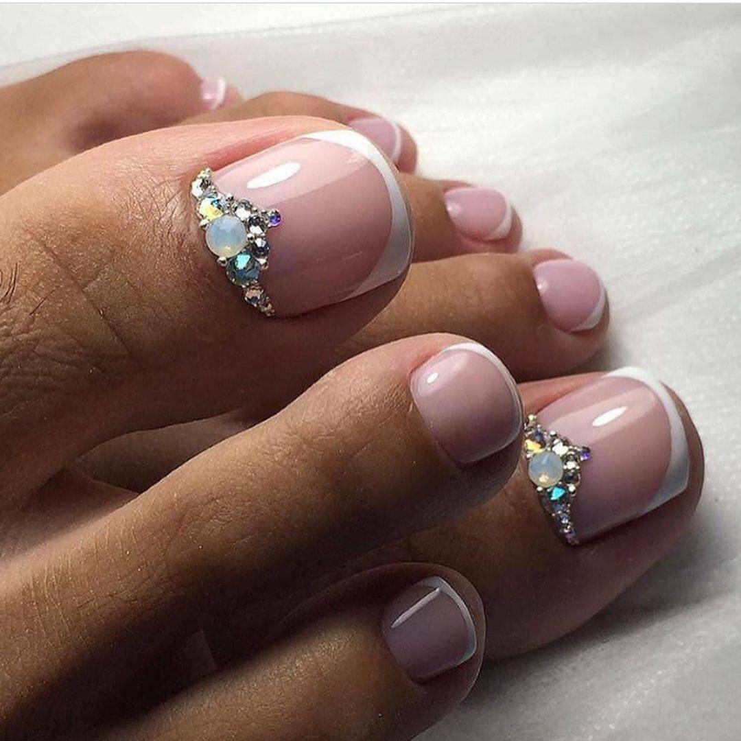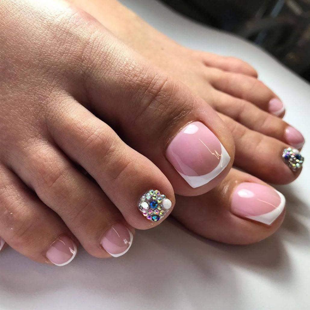 Ноготь на большом пальце можно дополнительно украсить стразами, на фото – идеи летнего педикюра 2021 с использованием акцента: