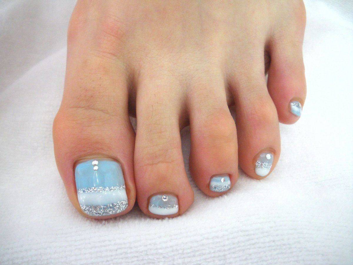 Приглушенные цвета выглядят естественно и натурально. Теплый бисквитный оттенок хорошо сочетается со стразами. Нежно-голубой цвет лака придаст педикюру легкости и воздушности.