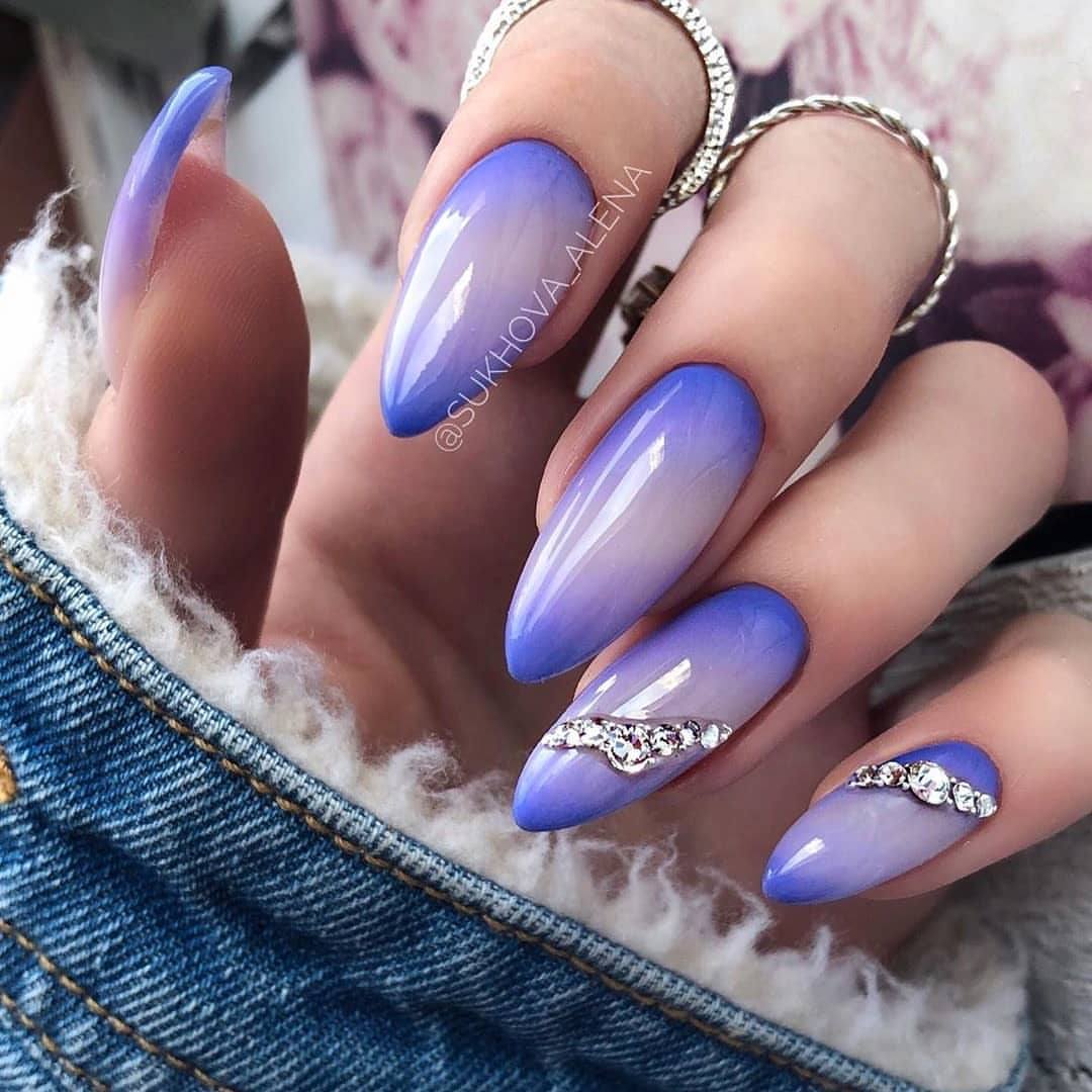 Градиент — наиболее красиво выглядит техника омбре при переходе из светло-коричневого в белый цвет. Возможен и противоположный вариант — градация из бледного телесного оттенка в темный бежевый. Такой переход не требует дополнительных украшений, однако можно добавить немного прозрачных страз для разнообразия повседневного дизайна.
