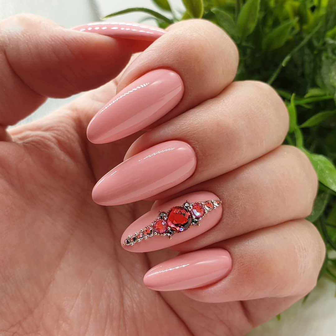 Камешки здесь выступают акцентирующим элементом, именно это свойство и сдерживает многих дам в выборе. Особенно, если у них есть комплексы в плане правильного подбора расцветки и формы самой пластины. К тому же многие побаиваются, что они не очень качественно фиксируются и, в самый неподходящий момент, могут попросту отвалиться.