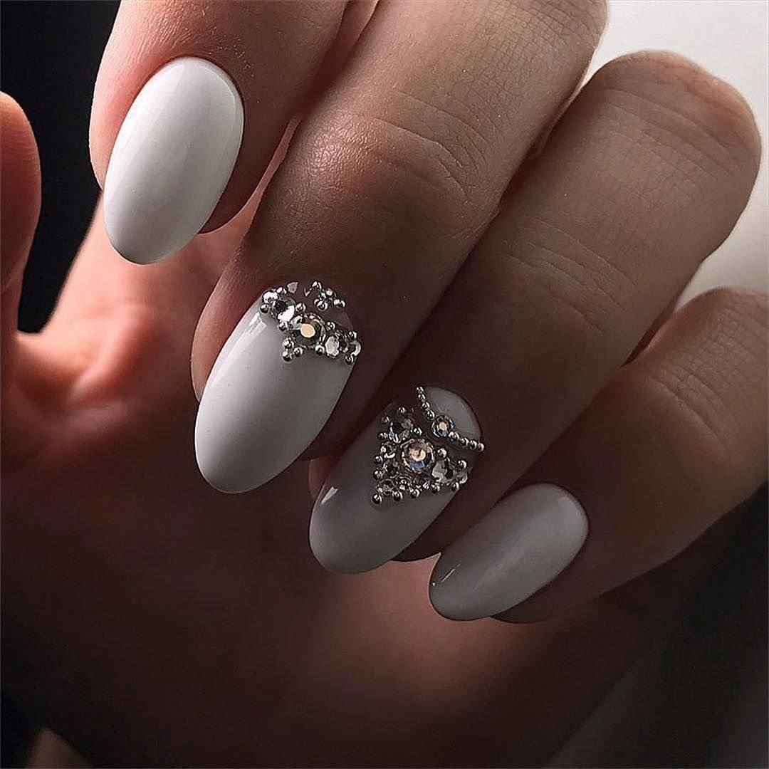 Освежить и разнообразить маникюр в белом исполнении можно при помощи переливающихся кристалликов. Если хочется получить нежный, легкий или романтический маникюр, то стильный белый дизайн с кокетливыми стразами станет самым утонченным и подходящим вариантом. Такой декор наиболее часто пользуется популярностью в выполнении свадебного дизайна. При помощи игривых кристаллов выделяют улыбочку французского маникюра или основание лунки, сочетают с объемными рисунками, выполняют легкие узоры. Таким способом можно смело воплотить в реальность все свои заветные мечты сказочного маникюра.