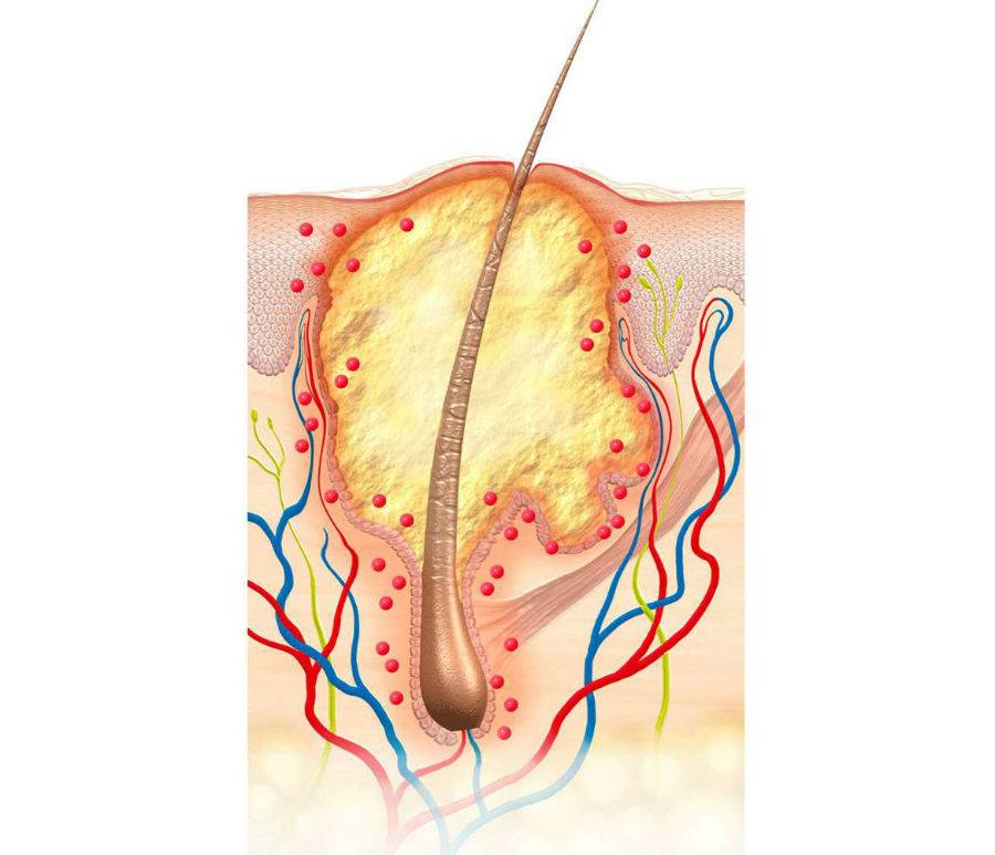 Кроме объема выделяемого кожного сала, имеет значение и его густота. Чем гуще секрет, тем труднее ему выделяться наружу. Обильный густой секрет буквально «распирает» стенки железы, отчего на коже видны уплотнения разного диаметра: от малюсеньких шариков до довольно крупных узлов, над которыми даже может меняться цвет кожи, приобретая чуть синеватый оттенок. Скопление сального секрета привлекает бактерий, обитающих на коже, так как сальный секрет – прекрасная питательная среда для них. Размножаясь, они вызывают воспаление, болезненность и покраснение кожи. Когда не устранен основной дефект — застойное скопление сала, — такое местное воспаление может «тлеть» неделями, формируя угри, или прыщики.