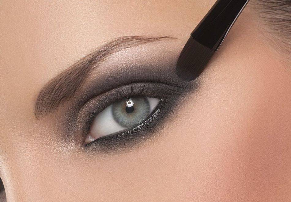 - Нанесите выбранный вами продукт на верхнее веко и тщательно растушуйте с помощью круглой кисти.