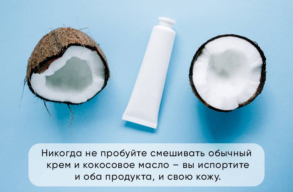 Также никогда не пробуйте смешивать обычный крем и кокосовое масло – вы испортите и оба продукта, и свою кожу.