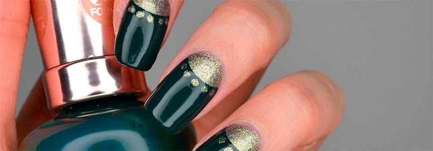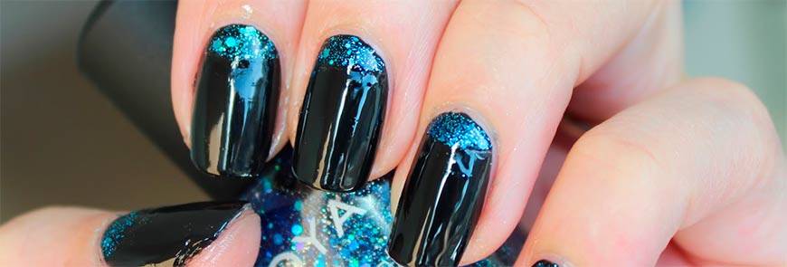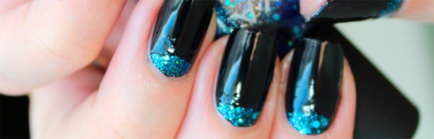 Длинные ногти позволяют сделать покрытие ноготков лаком тёмного цвета с блёстками, при этом лунку можно не закрашивать. Ещё один тренд сезона – маникюр в стиле «битое стекло». По-другому его ещё называют зеркальным. При этом дизайне лунку или вообще не закрашивают, или покрывают прозрачным лаком. На ноготок накладывают кусочки фольги или голографической пленки. Сверху маникюр покрывают топом.