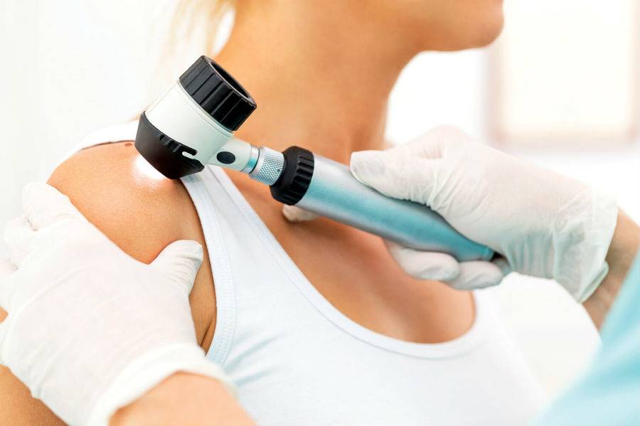 Дерматоскопия — это обследование, при котором дерматолог использует дерматоскоп. Это инструмент, объединяющий в себе увеличительное стекло в 10 или 20 раз, увеличивающее исследуемый фрагмент, оснащенный стандартизированным источником света. В таких условиях врач может изначально оценить кожные изменения.
